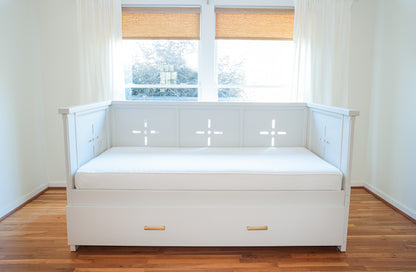 The Amelia Daybed is a new creation derived from an old world tradition. The style for the Gibbs House “Amelia Daybed” was fashioned after the late 1890’s trend of drilling vent holes in pantry cabinetry. This dreamy style has resurfaced in modern kitchens today but never before on a daybed. This polished inspiration was imagined by Allison & piece-milled with precision by the Gibbs House team.